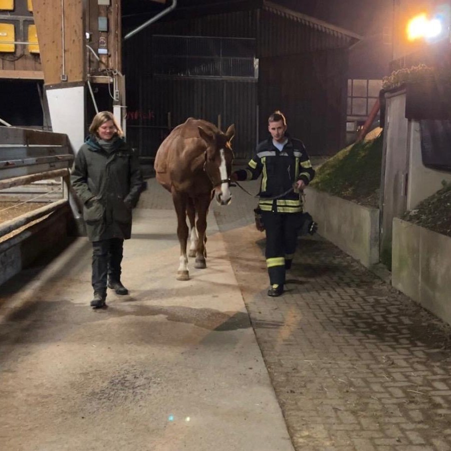 Die vorbereiteten Rettungswege führten direkt in eingezäunte Bereiche wie Reitplatz oder Koppel, um zu verhindern, dass die Tiere unkontrolliert über Straßen oder durch den Ort laufen.