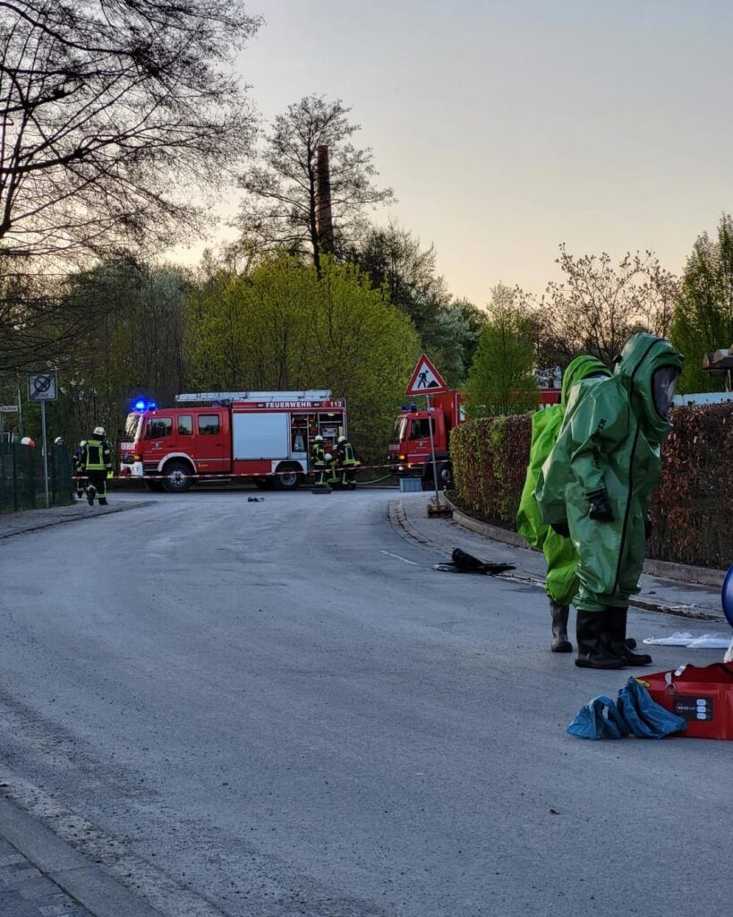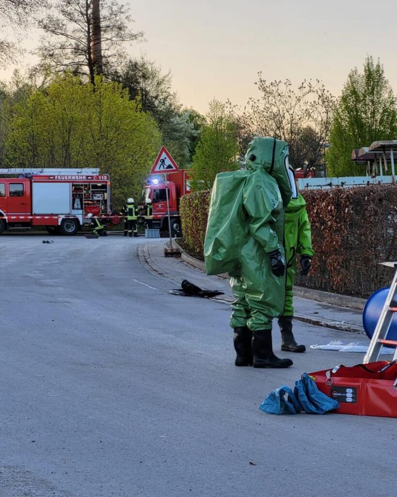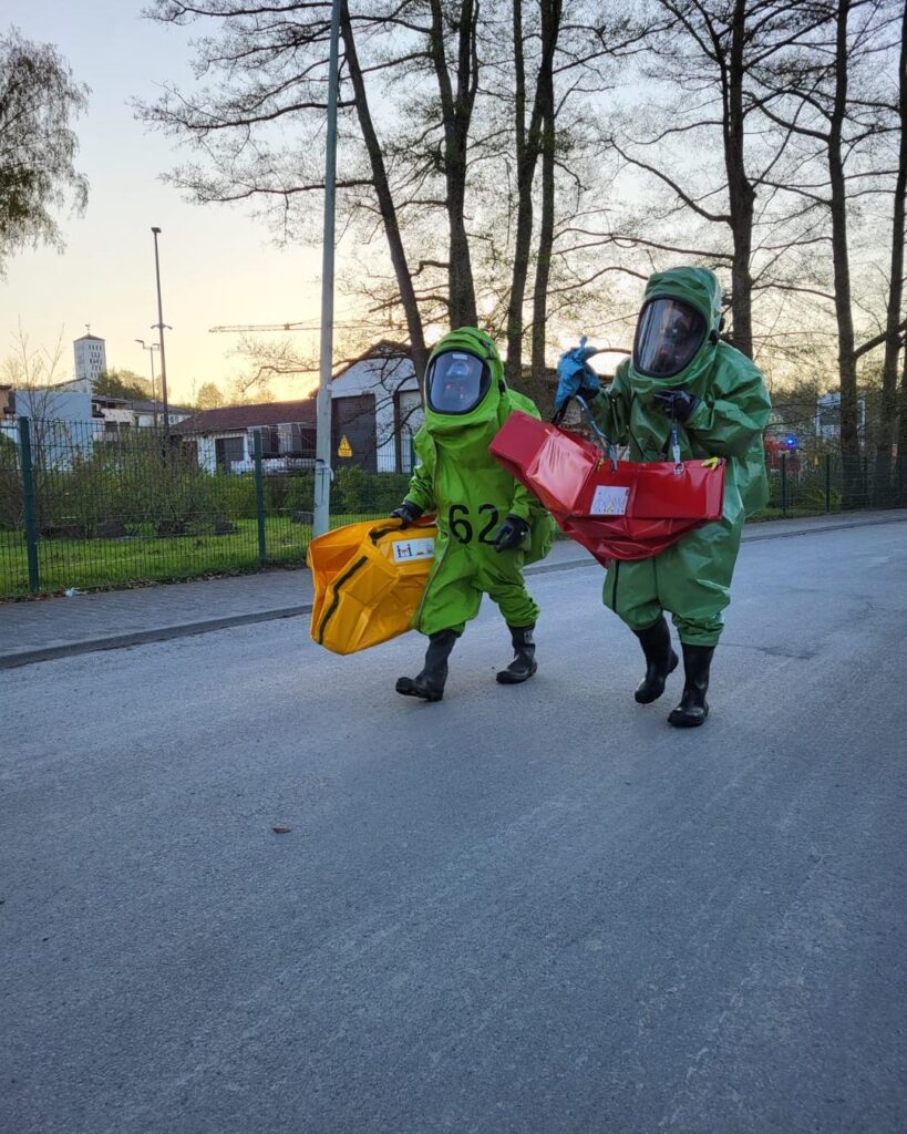 Anschließend gingen die Kräfte der ABC Einheit mit Chemikalienschutzanzügen zur Erkundung der Einsatzstelle vor und dichteten