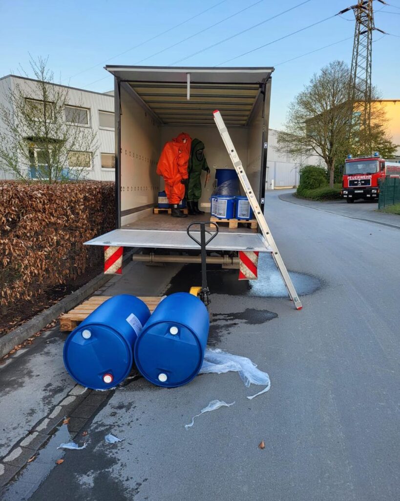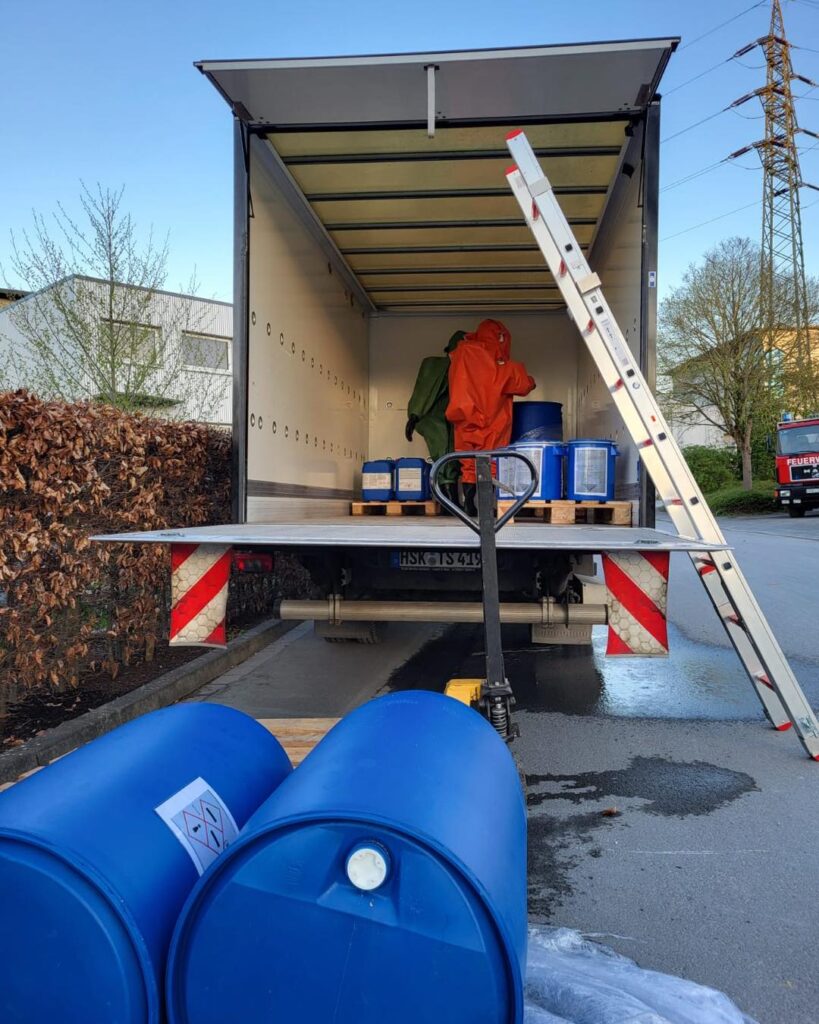 ein leckgeschlagenes Fass ab. Ebenfalls wurden Auffangwannen eingesetzt um austretenden Gefahrstoff aufzunehmen.