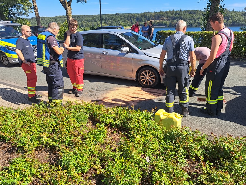 Die 9 Einsatzkräfte der Feuerwehr nahmen ausgelaufene Betriebsmittel auf und sicherten die Unfallstelle, unterstützt von einem Trupp der ortsansässigen DLRG, während der