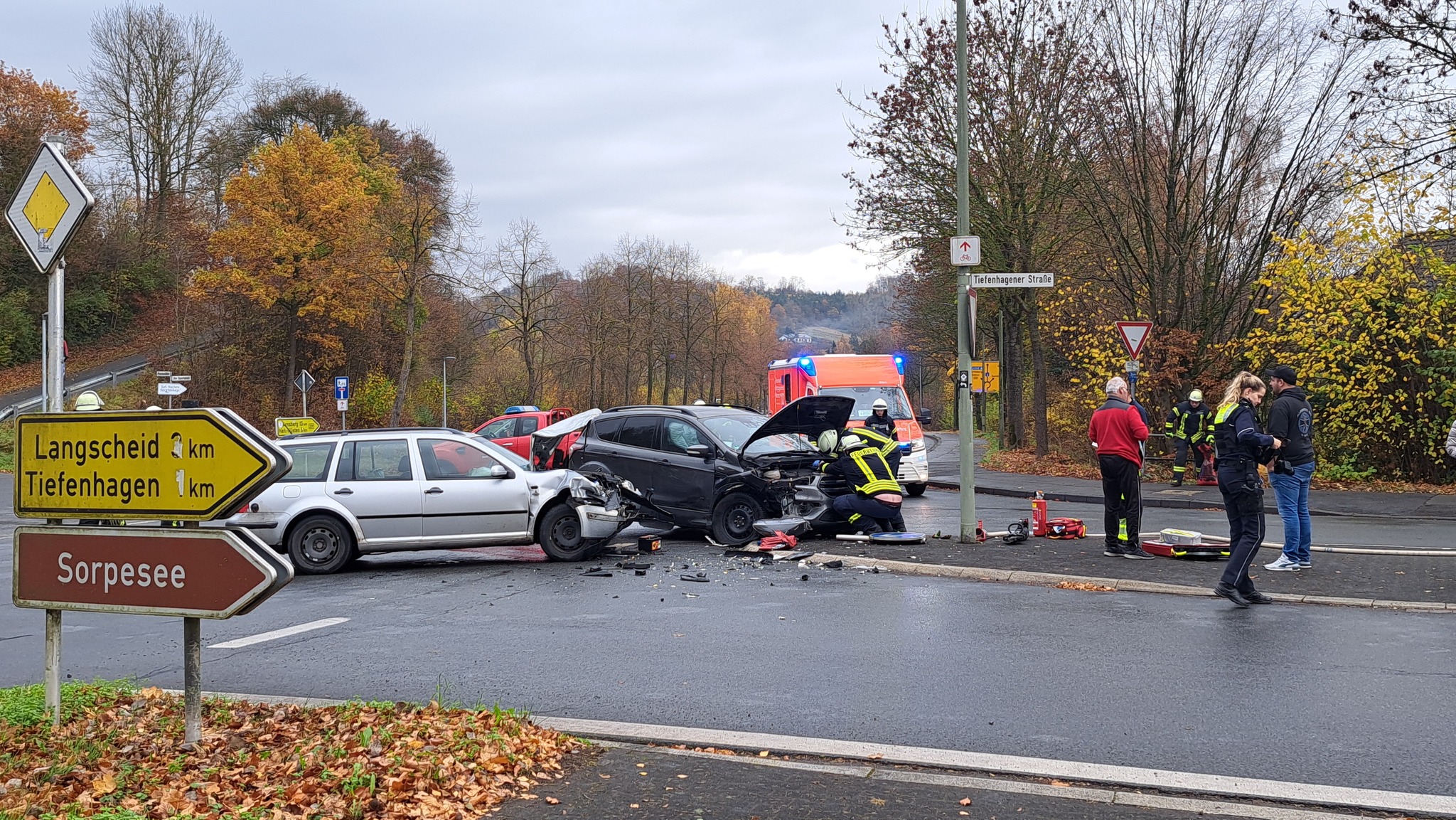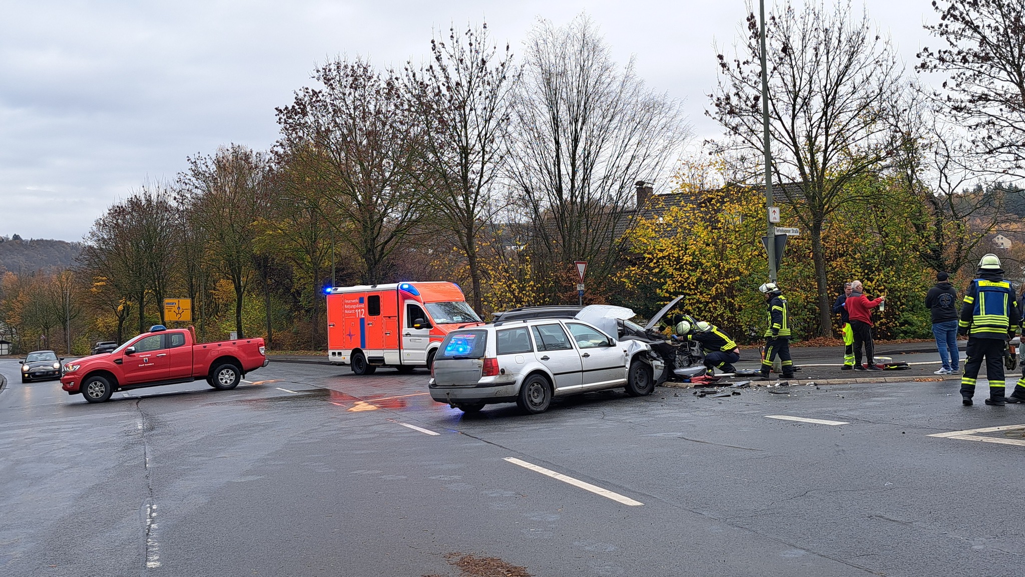 Die Einheit Hachen wurde um 11:25 Uhr zusammen mit Rettungsdienst und Polizei zu einem Kreuzungszusammenstoß zwischen zwei Pkw im Bereich „Perlmühle“/Tiefenhagener Straße alarmiert worden.