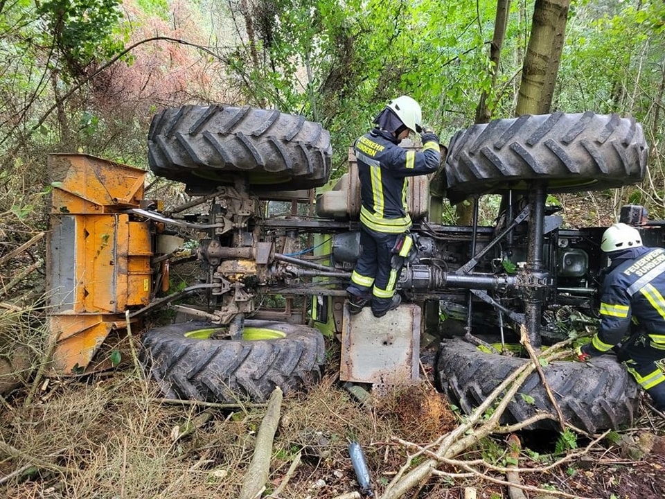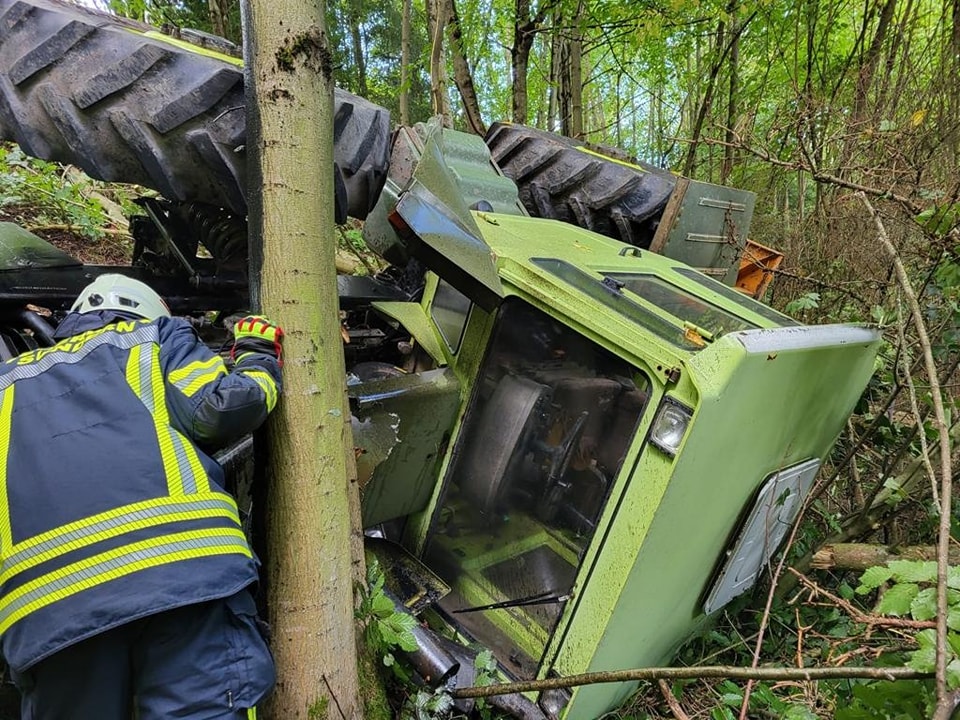 Bei dem als „unklare Rauchmeldung im Freien“ alarmierten Einsatz war oberhalb des Lockweges eine Holzrückemaschine von einem Waldweg einen Abhang 30 Meter herabgestürzt. Auslaufende Betriebsstoffe waren auf den Motorblock getropft und produzierten eine stärkere Rauchentwicklung.