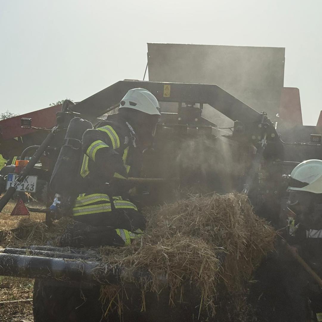 Beim Eintreffen des ersten Löschfahrzeugs konnte eine brennende Ballenpresse erkundet werden. Das Feuer hatte sich weiterhin auf das umliegende Stoppelfeld ausgebreitet. Durch einen direkt eingeleiteten und gezielten Löschangriff konnte eine weitere Ausbreitung des Feuers verhindert werden. Zeitgleich wurde die Ballenpresse abgelöscht.