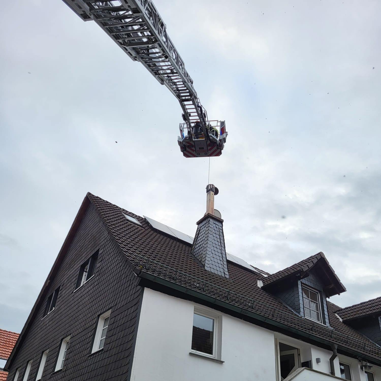 Die Drehleiter wurde zügig in Stellung gebracht und der Kamin über den Drehleiterkorb mit entsprechendem Kehrwerkzeug gereinigt und rußbefreit.