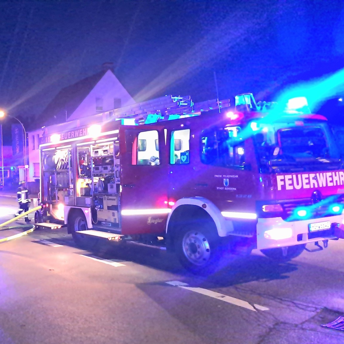 Zur Einsatzstelle alarmiert waren die Einheiten Sundern und Westenfeld sowie die Drehleiter, der Einsatzleitwagen mit der IuK-Einheit, die Atemschutz-Notfallstaffel aus Stockum, die Atemschutzwerkstatt sowie der B-Dienst.