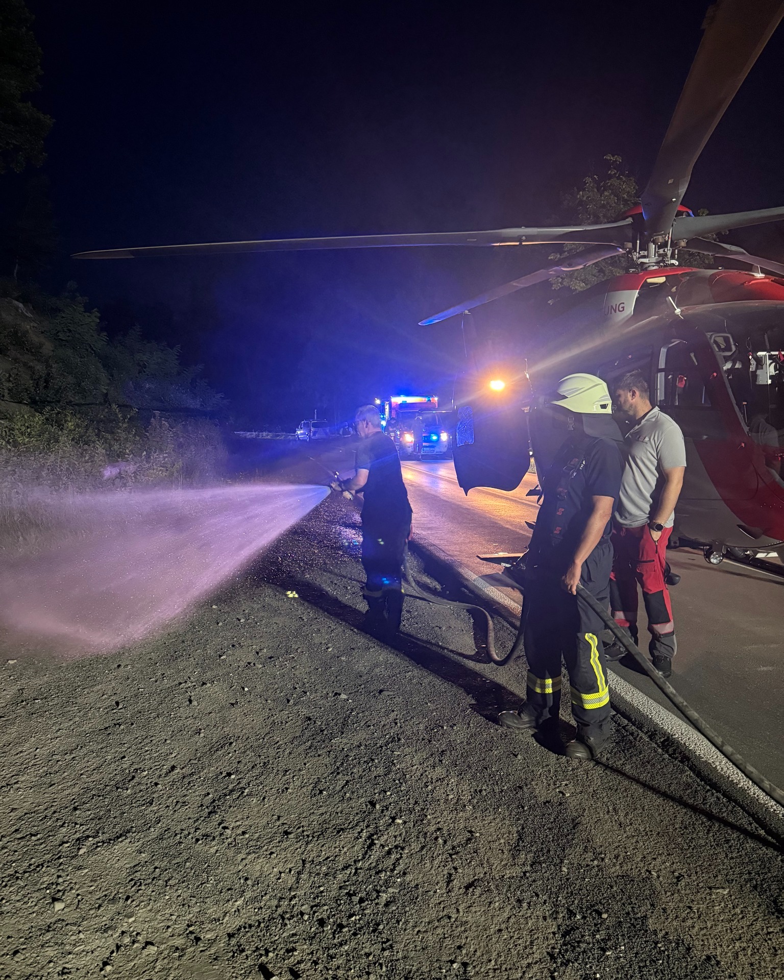 Aufgrund der einsetzenden Dunkelheit alarmierte die Leitstelle Sauerland gegen 21:13 Uhr die Einheit Langscheid zur Ausleuchtung und Absicherung der Einsatzstelle, um dem Rettungshubschrauber Christoph Gießen eine reibungslose Landung zu ermöglichen. Im Zuge der Absicherungsmaßnahmen wurde u. a. auch eine Schotterfläche mit dem Schnellangriffsrohr befeuchtet, um die Staubbildung beim Abflug des Hubschraubers zu minimieren.