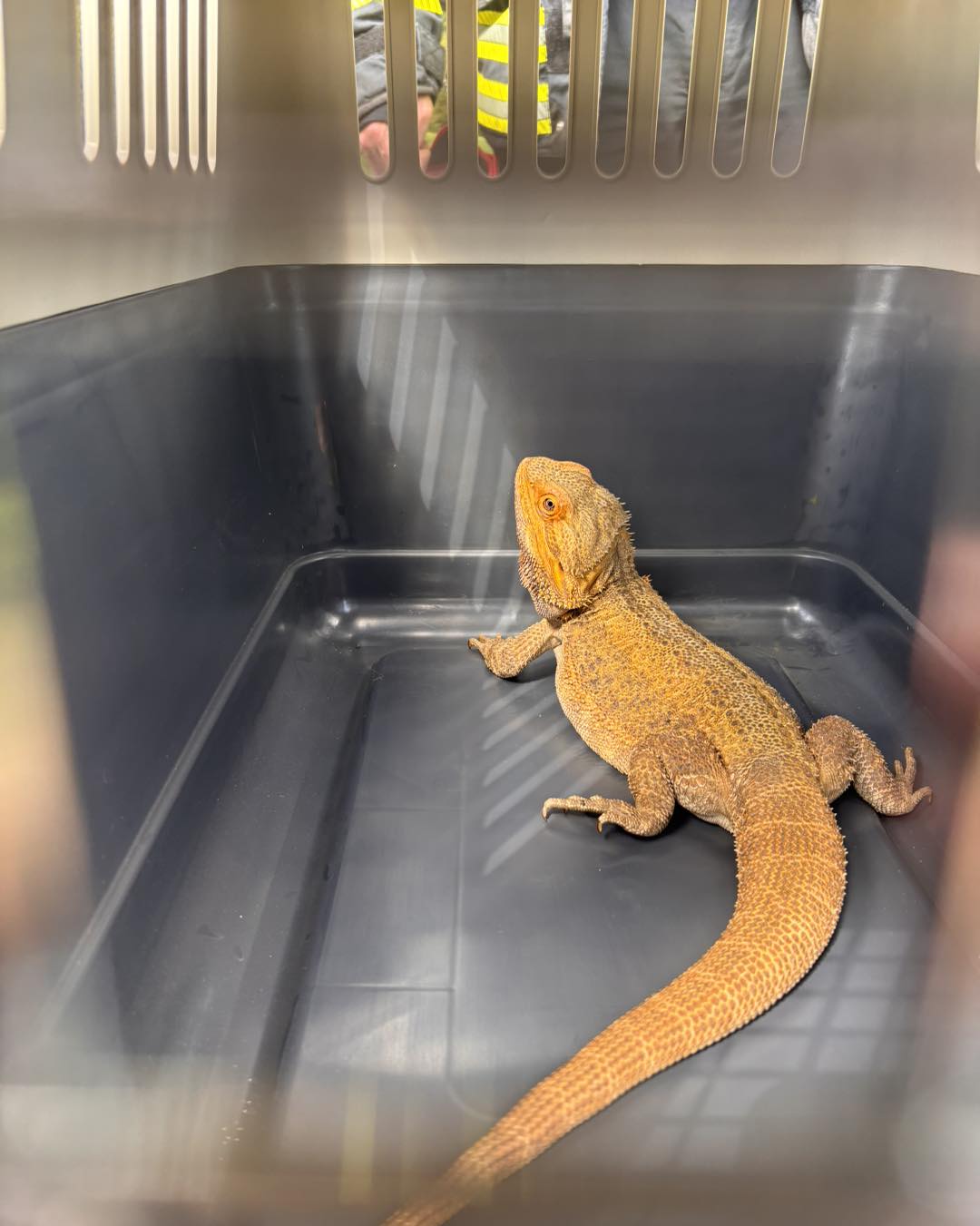 Eine Bartagame sonnte sich auf der Straße und wurde bereits durch eine Mitarbeiterin des Ordnungsamts gegen den fließenden Verkehr abgesichert.
