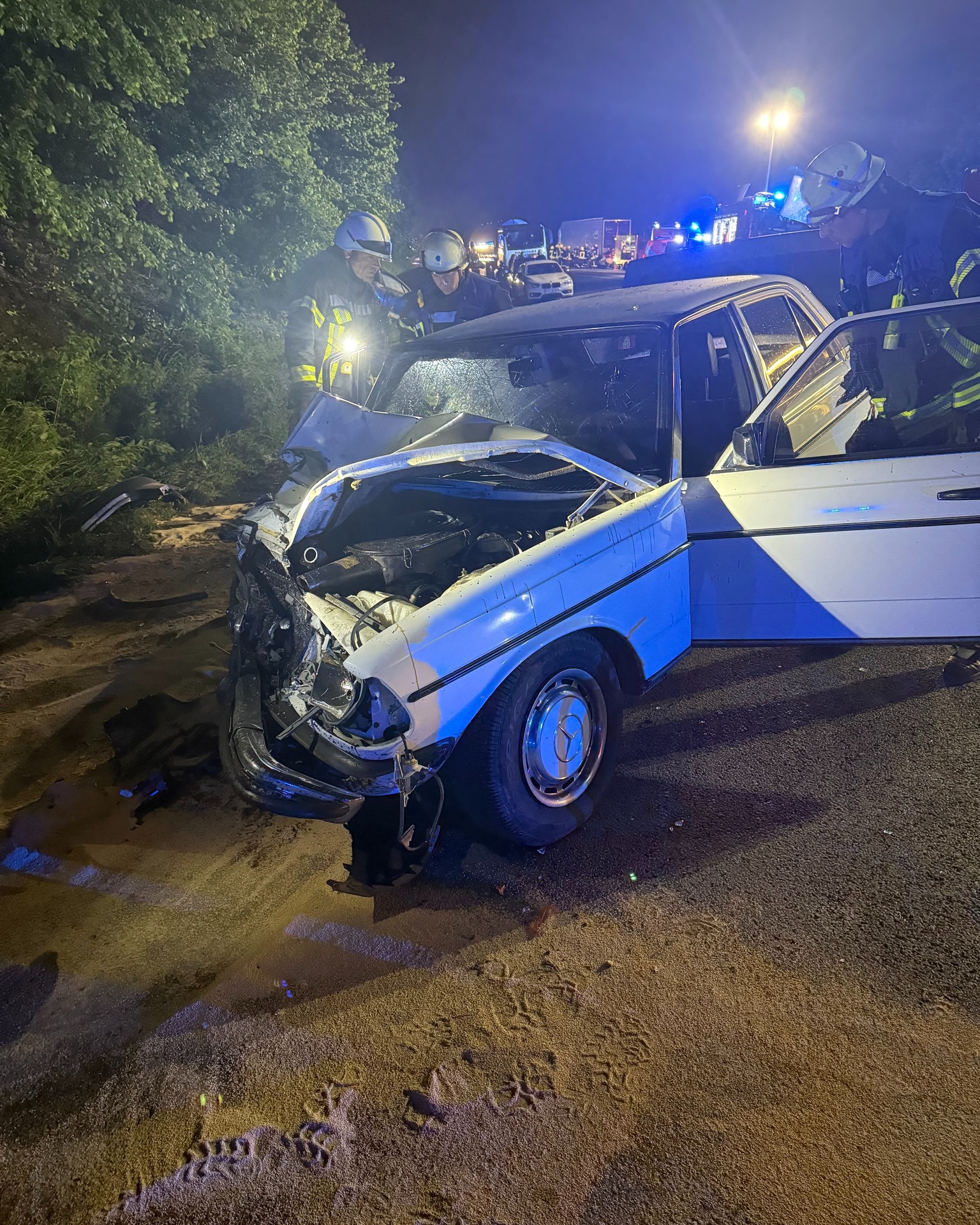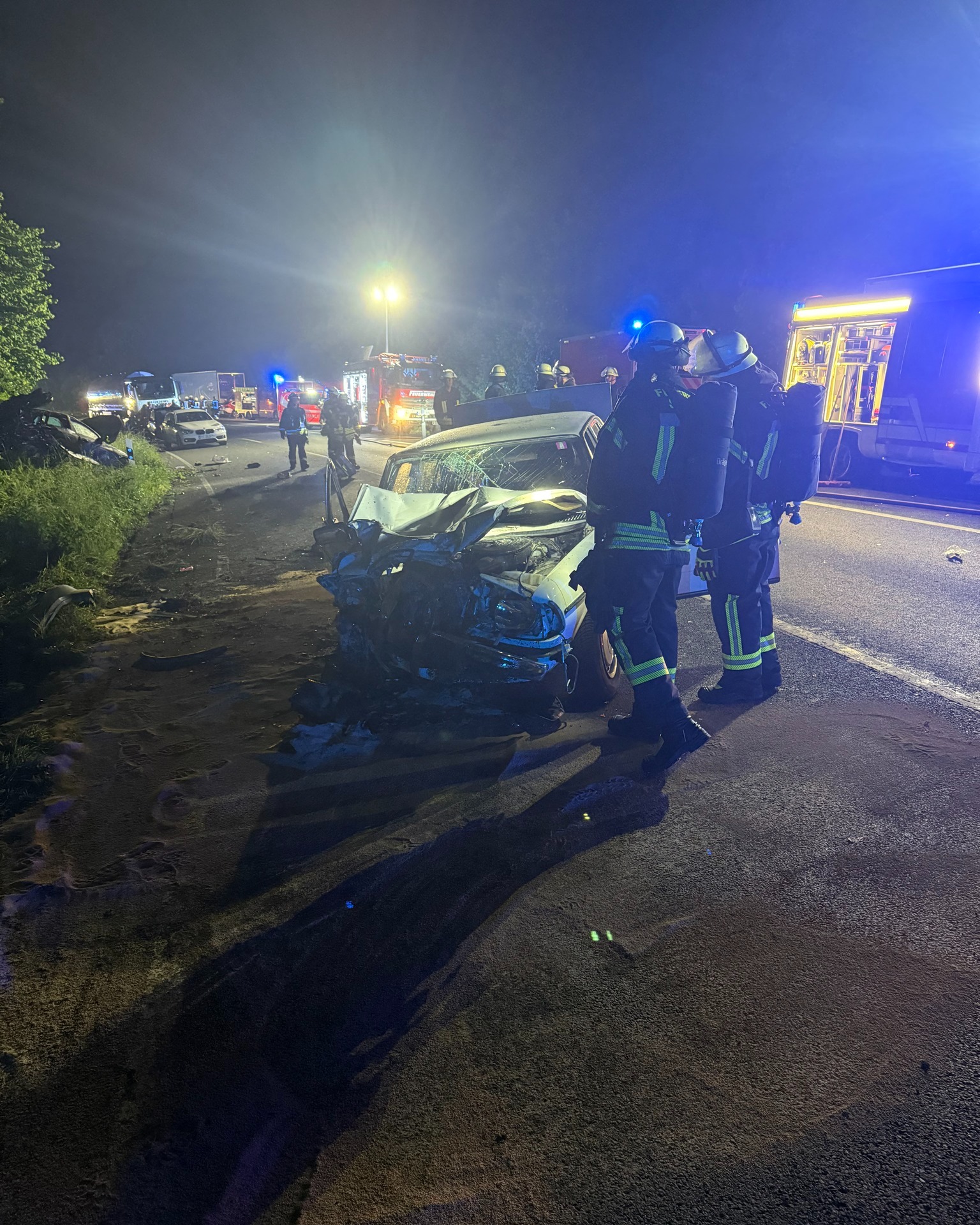 Vor Ort stellte sich heraus, dass zwei PKW kollidiert waren. Beide Fahrzeuge erlitten dabei Totalschaden und mussten durch ein Abschleppunternehmen geborgen werden. Eine schwer verletzte Person war zunächst im Fahrzeug eingeschlossen, konnte jedoch noch vor Eintreffen der Feuerwehr durch Ersthelfer befreit werden.