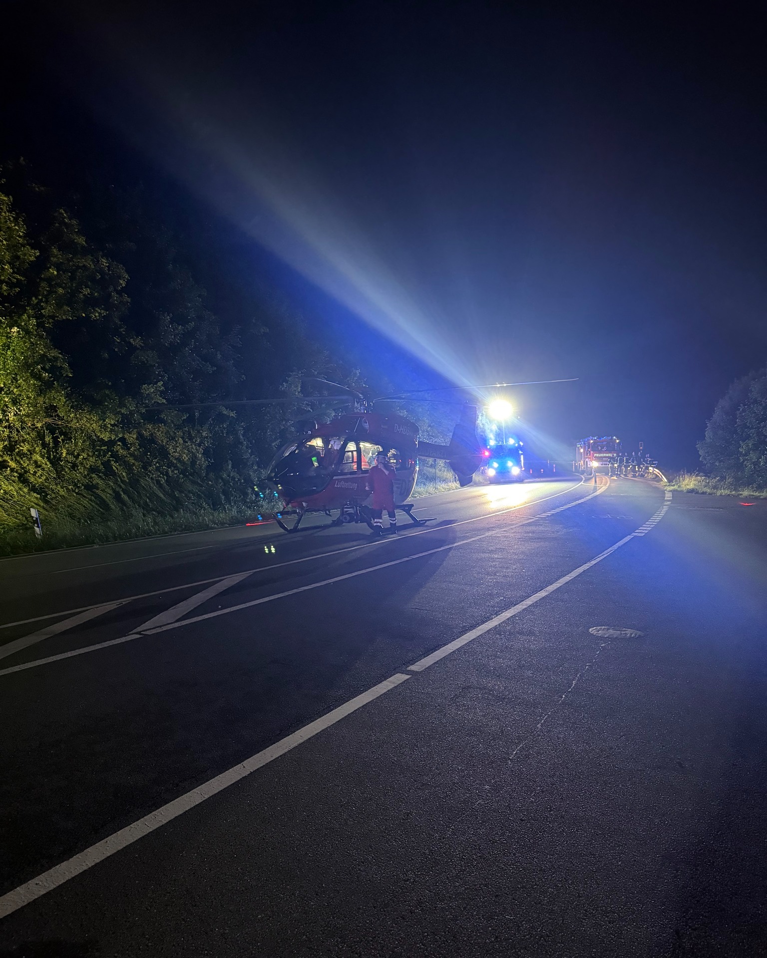 Aufgrund der Schwere der Verletzungen wurde der Rettungshubschrauber aus Dortmund zur Einsatzstelle alarmiert. Zwei weitere Unfallbeteiligte wurden mit Rettungswagen den umliegenden Krankenhäusern zugeführt. Die Feuerwehr bereitete die Landung des Hubschraubers durch großflächige Ausleuchtung des Landeplatzes vor und unterstützte den Rettungsdienst. Zudem stellten wir den Brandschutz sicher und nahmen auslaufende Betriebsmittel auf, um eine Umweltgefährdung zu verhindern.