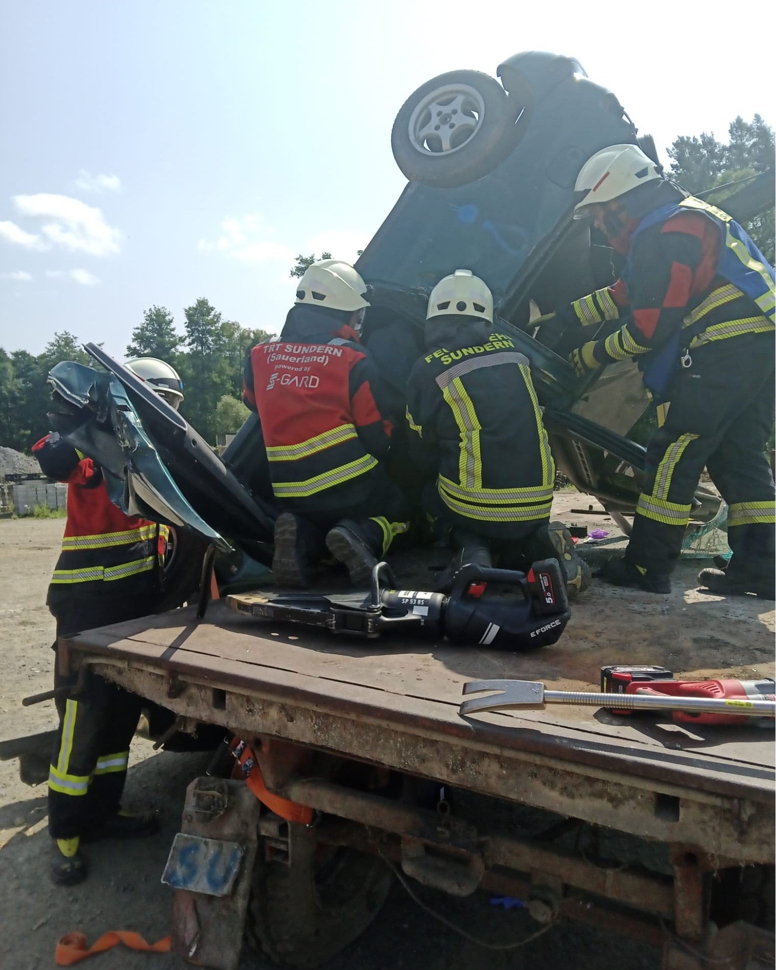 Das TRT-Team der Feuerwehr Sundern, was sich überwiegend mit erweiterter Technischer Hilfe befasst, übte am vergangenen Samstag einige herausfordernde Einsatzlagen. Von einem auf einen Fahrradfahrer gekippten landwirtschaftlichen Anhänger bis hin zu einem PKW der fast senkrecht zu stehend scheint.